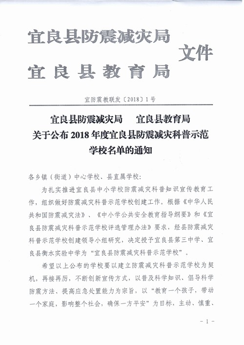 关于公布2018年度宜良县防震减灾科普示范学校名单的通知