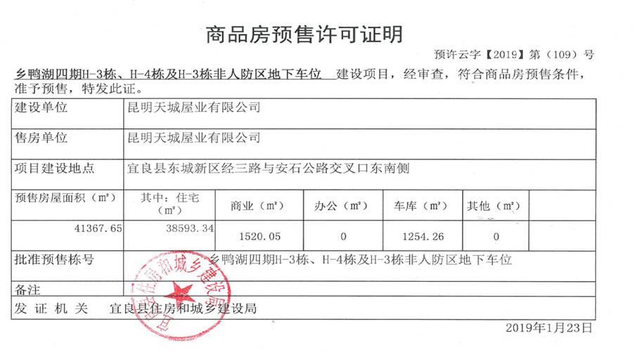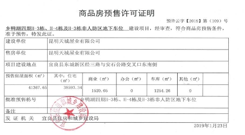 预售许可 乡鸭湖四期H-3、H-4栋及H-3栋非人防区地下车位