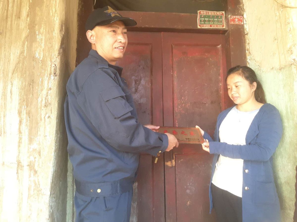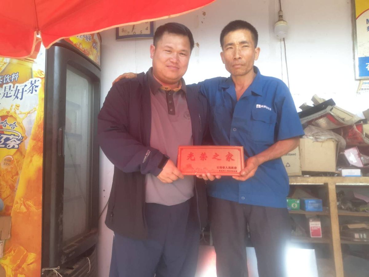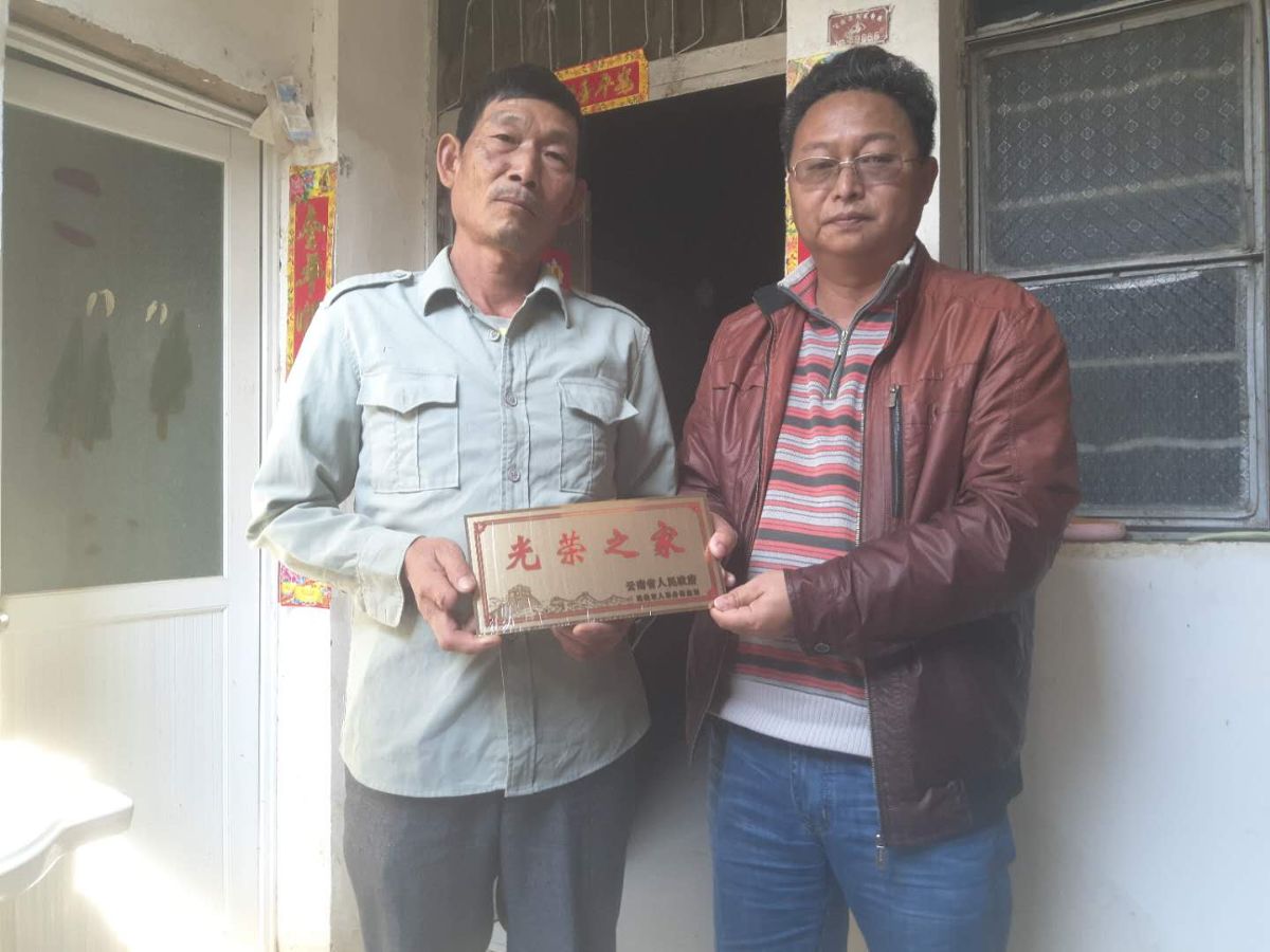 镇领导为烈属、军属和退役军人等家庭代表华润各村(社区)发放“光荣之家”牌。