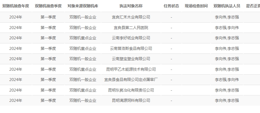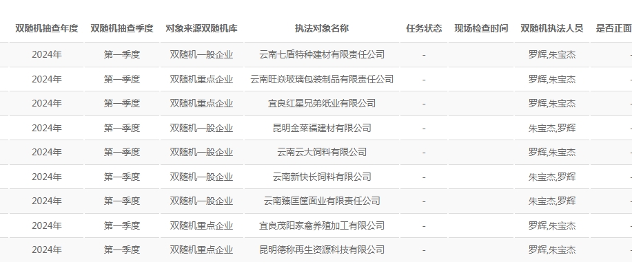 昆明市生态环境局宜良分局2024年1季度在云南省移动执法系统内随机抽取检查对象18家,其中重点管理企业8家,一般管理企业10家,均按计划要求开展了检查,检查未发现相关环境违法问题,对存在的一般性问题均进行了现场检查指导,并提出了相关整改要求。